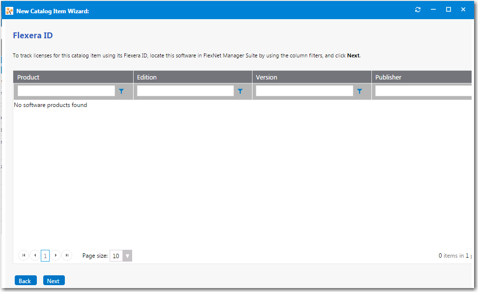 To track licenses for this catalog item using its Flexera ID, use the column filters to locate this catalog item in FlexNet Manager Suite, select it, and click Next. The Ready to Create panel opens.