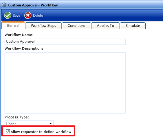 Create a new approval workflow and choose the Allow requester to define workflow option.