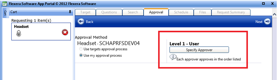 Attach the approval workflow to a catalog item. When you checkout the software, you will see the following screen with the option to specify the approver: