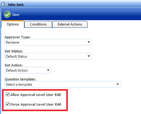 Create a new workflow step, assign a default approver, and choose the Allow Approval Level User Edit and Force Approval Level User Edit options.
