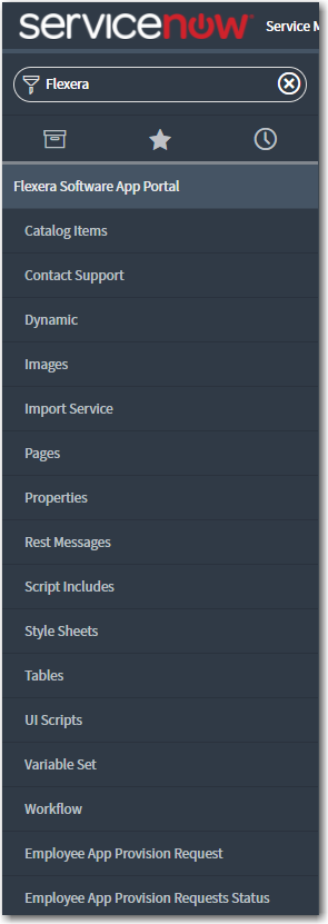 Click Commit Update Set. As soon as the update set is committed, if you enter Flexera in the ServiceNow search box, and you will see the following new items listed in the menu: